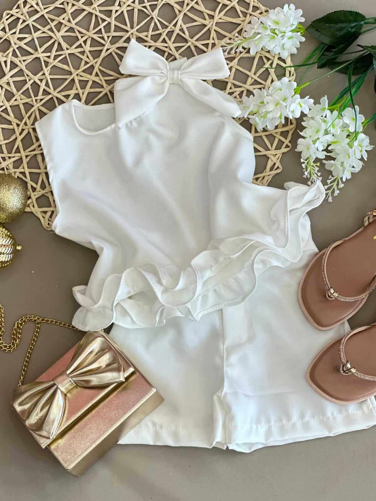 puro detalhe de sofisticação. O short cintura alta completa o look com zíper falso e botão frontal discreto,